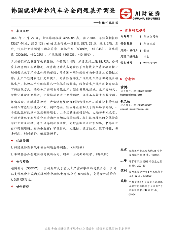 【川财证券】【20200729】制造行业日报:韩国就特斯拉汽车安全问题展开调查-4页