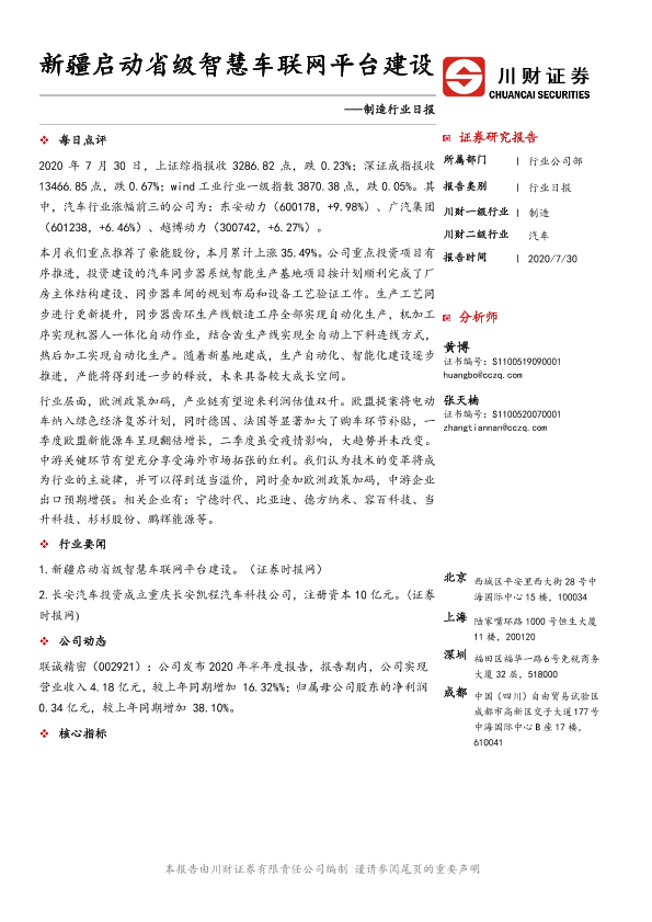 【川财证券】【20200730】制造行业日报:新疆启动省级智慧车联网平台建设-4页