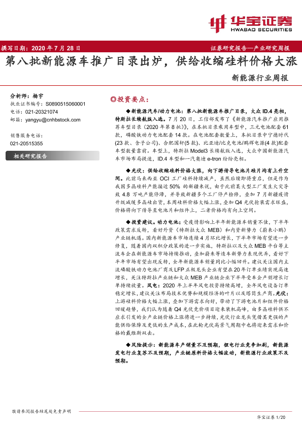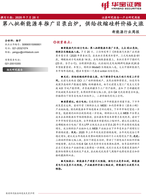 【华宝证券】【20200728】20200728-华宝证券-新能源行业周报:第八批新能源车推广目录出炉,供给收缩硅料价格大涨-20页