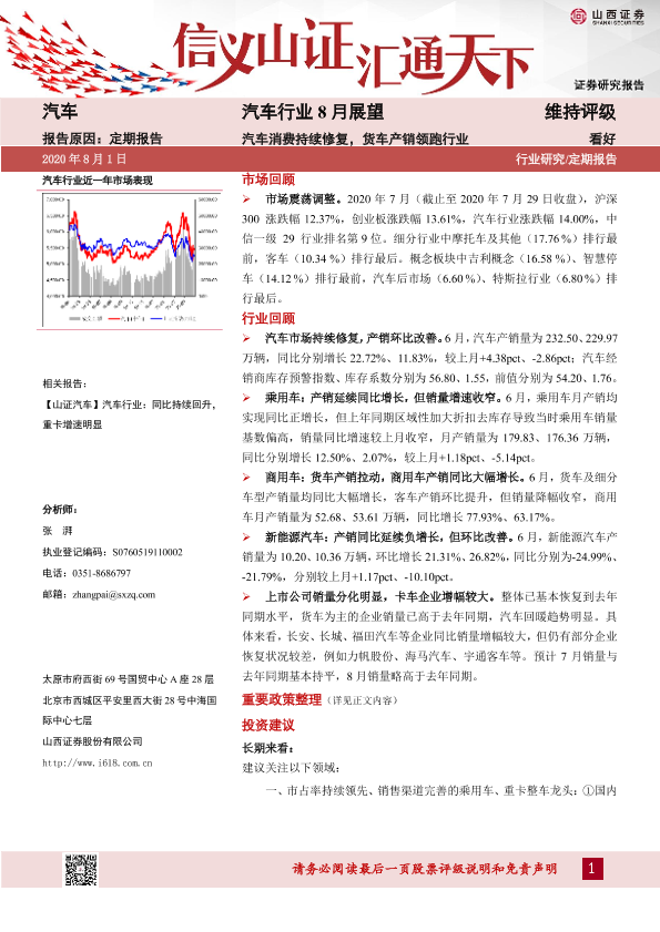 【山西证券】【20200801】汽车行业8月展望:汽车消费持续修复,货车产销领跑行业-29页