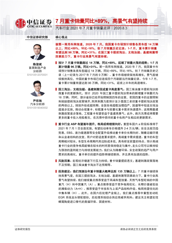【中信证券】【20200803】汽车行业2020年7月重卡销量点评:7月重卡销量同比89%,高景气有望持续-4页