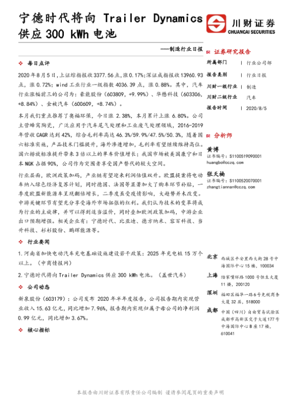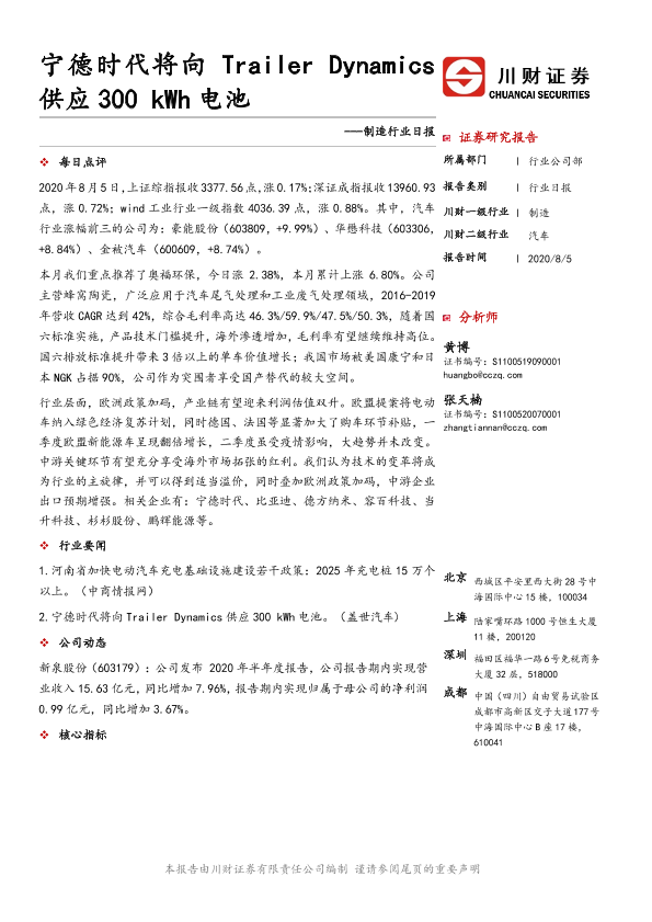 【川财证券】【20200805】制造行业日报:宁德时代将向Trailer Dynamics供应300kWh电池-4页