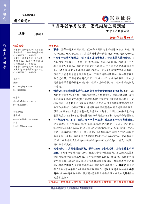 【兴业证券】【20200805】7月再创单月记录,景气延续上调预测——重卡7月销量点评-6页