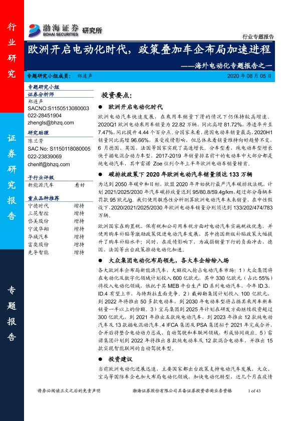 【渤海证券】【20200805】欧洲开启电动化时代,政策叠加车企布局加速进程-43页