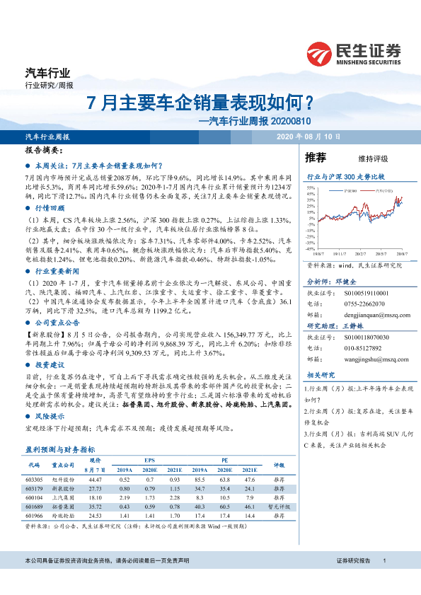【民生证券】【20200810】20200810-民生证券-汽车行业周报:7月主要车企销量表现如何?-20页