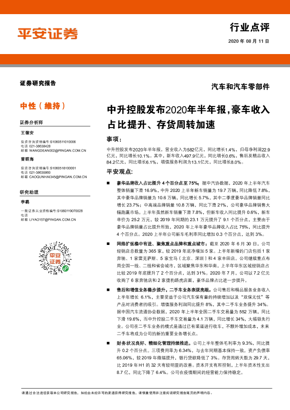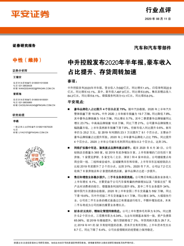【平安证券】【20200811】汽车和汽车零部件行业点评:中升控股发布2020年半年报,豪车收入占比提升、存货周转加速-4页