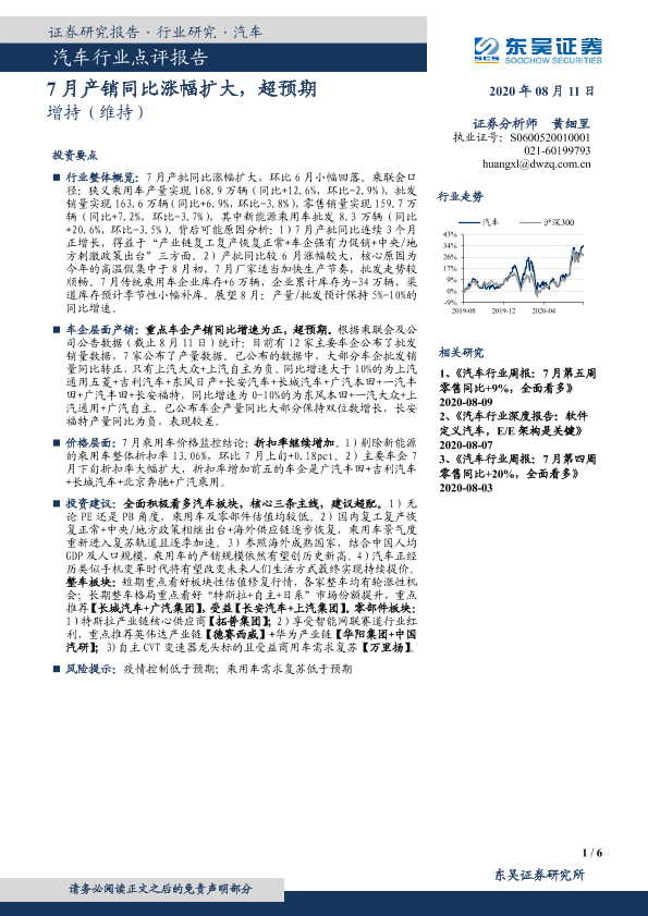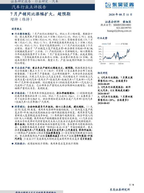 【东吴证券】【20200811】汽车行业点评报告:7月产销同比涨幅扩大,超预期-6页