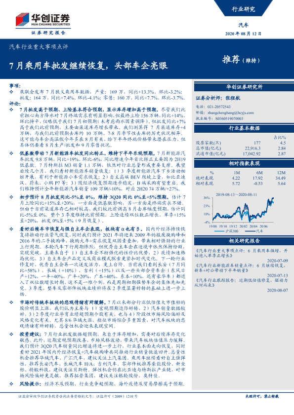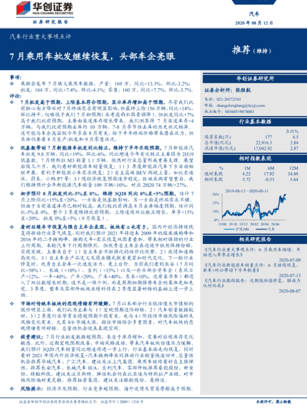 【华创证券】【20200812】汽车行业重大事项点评:7月乘用车批发继续恢复,头部车企亮眼-12页