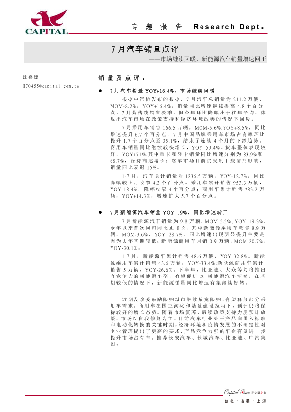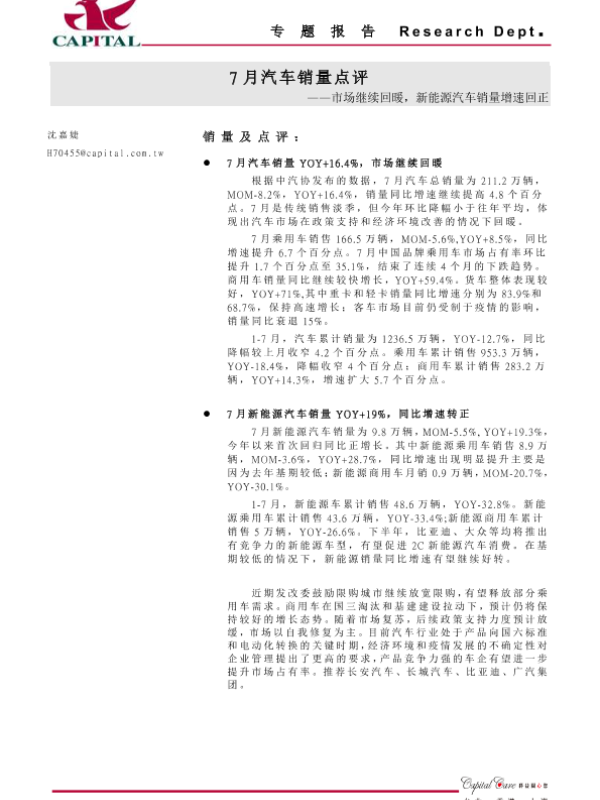 【群益证券】【20200812】7月汽车销量点评:市场继续回暖,新能源汽车销量增速回正-2页