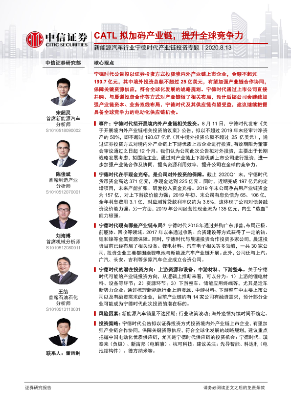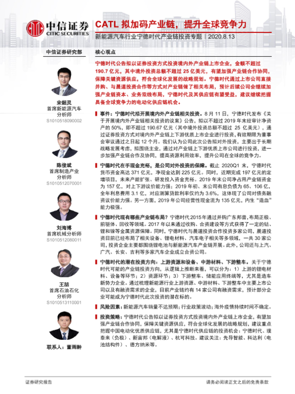 【中信证券】【20200813】新能源汽车行业宁德时代产业链投资专题:CATL拟加码产业链,提升全球竞争力-10页