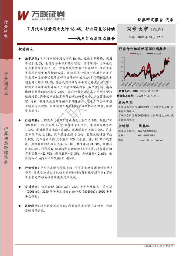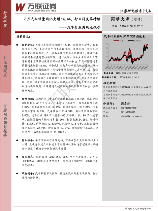 【万联证券】【20200817】20200817-万联证券-汽车行业周观点报告:7月汽车销量同比大增16.4%,行业弱复苏持续-11页