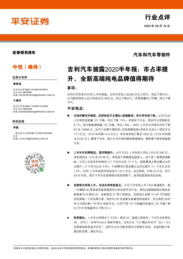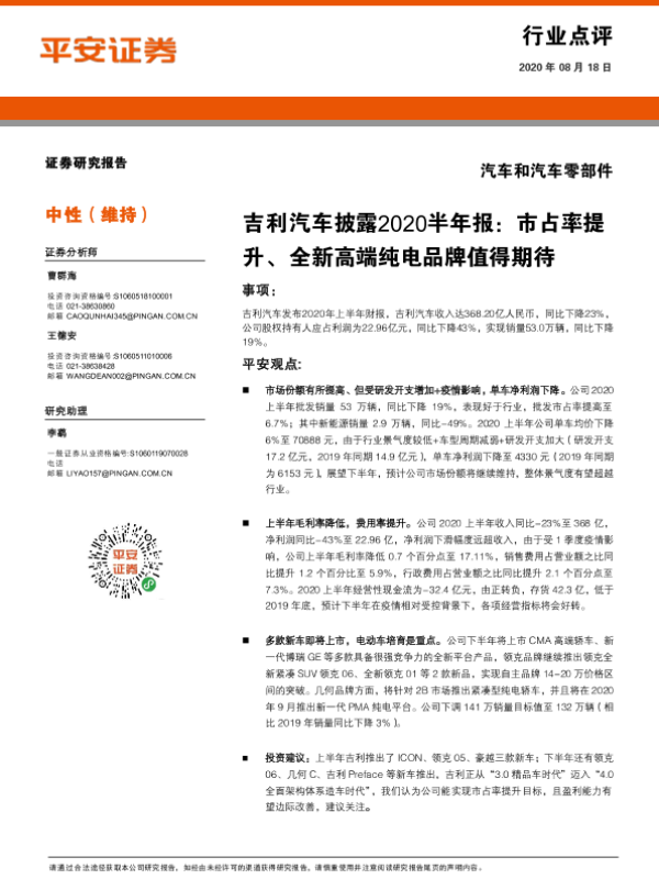 【平安证券】【20200818】汽车和汽车零部件行业点评:吉利汽车披露2020半年报:市占率提升、全新高端纯电品牌值得期待-3页