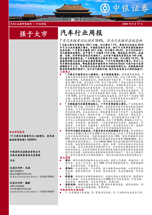 【中银证券】【20200817】20200817-中银证券-汽车行业周报:7月汽车销量同比增长16.4%,华为汽车操作系统亮相-16页