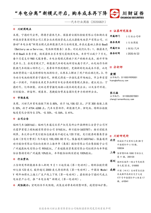 【川财证券】【20200822】20200822-川财证券-汽车行业周报:“车电分离”新模式开启,购车成本再下降-10页