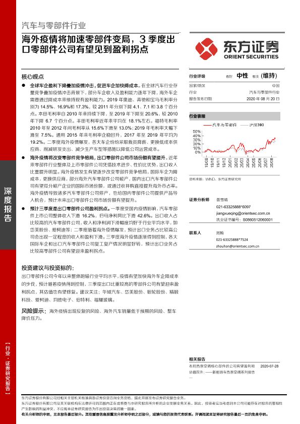 【东方证券】【20200820】海外疫情将加速零部件变局,3季度出口零部件公司有望见到盈利拐点-27页