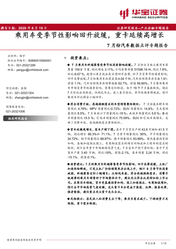 【华宝证券】【20200819】20200819-华宝证券-7月份汽车数据点评专题报告:乘用车受季节性影响回升放缓,重卡延续高增长-13页