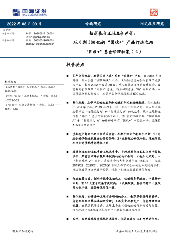 【国海证券】【20220809】“固收+”基金经理档案(三):招商基金王垠&余芽芳,从0到500亿的“固收+”产品打造之路-17页