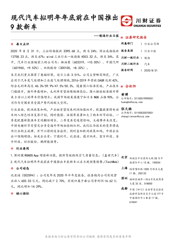 【川财证券】【20200831】制造行业日报:现代汽车拟明年年底前在中国推出9款新车-3页