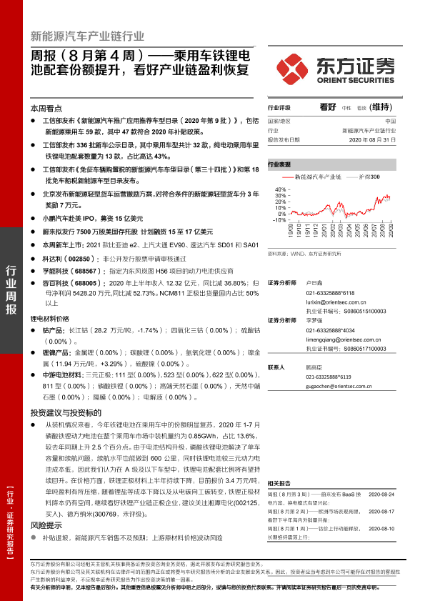 【东方证券】【20200831】新能源汽车产业链行业周报(8月第4周):乘用车铁锂电池配套份额提升,看好产业链盈利恢复-25页