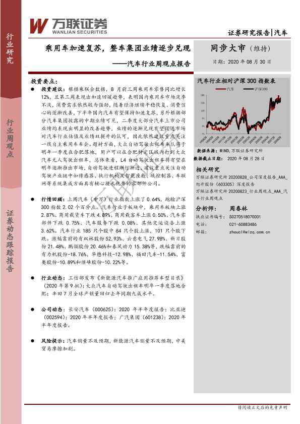 【万联证券】【20200830】20200830-万联证券-汽车行业周观点报告:乘用车加速复苏,整车集团业绩逐步兑现-10页