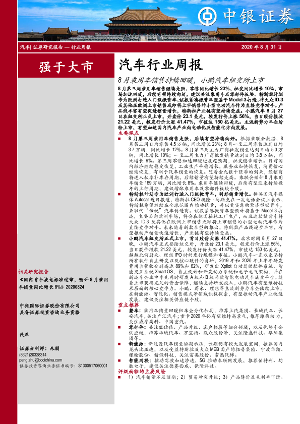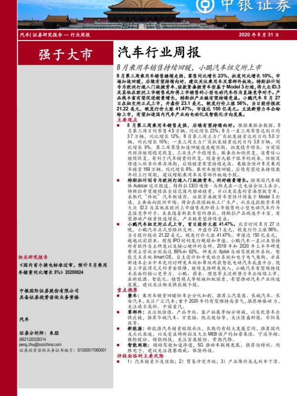 【中银证券】【20200831】20200831-中银证券-汽车行业周报:8月乘用车销售持续回暖,小鹏汽车纽交所上市-20页