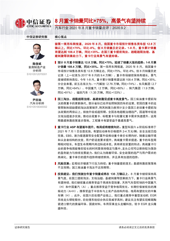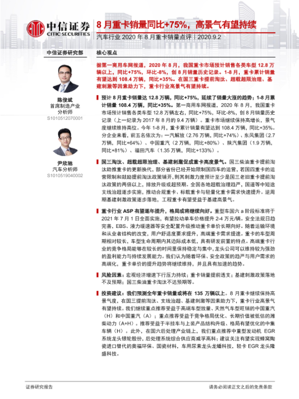 【中信证券】【20200902】汽车行业2020年8月重卡销量点评:8月重卡销量同比+75%,高景气有望持续-4页