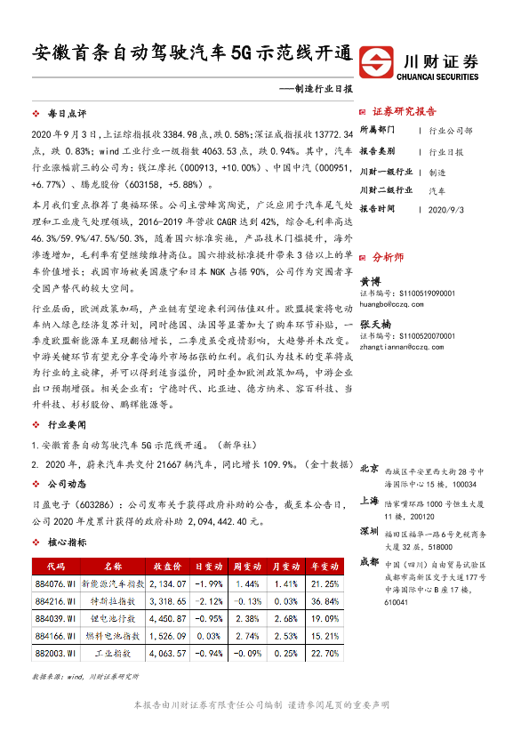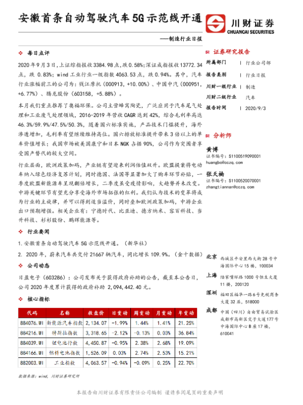 【川财证券】【20200903】制造行业日报:安徽首条自动驾驶汽车5G示范线开通-3页
