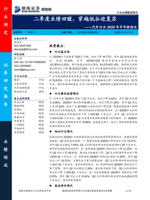 【渤海证券】【20200906】汽车行业2020年半年报综述:二季度业绩回暖,穿越低谷迎复苏-26页