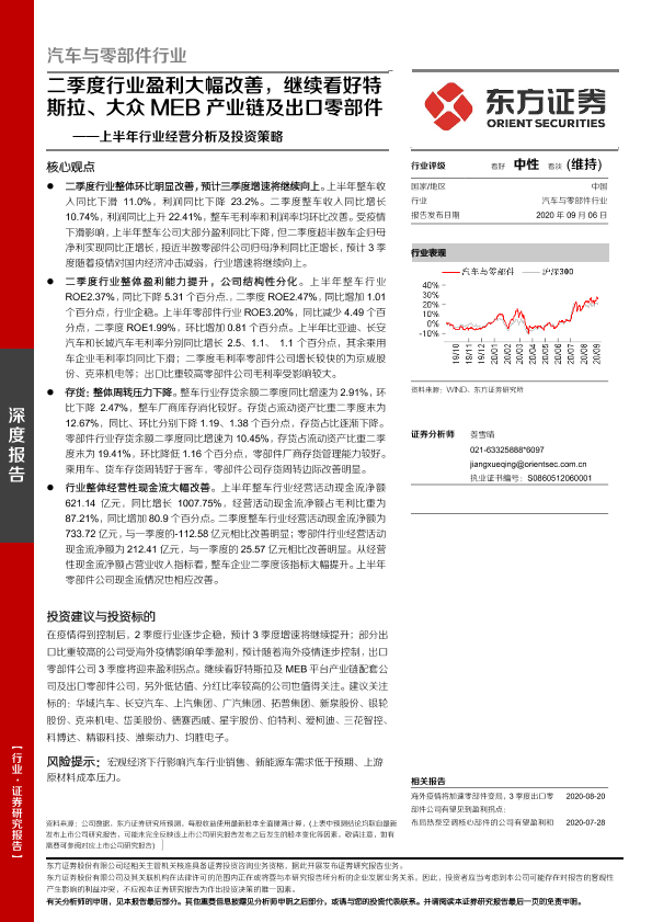 【东方证券】【20200906】汽车与零部件行业上半年行业经营分析及投资策略:二季度行业盈利大幅改善,继续看好特斯拉、大众MEB产业链及出口零部件-22页