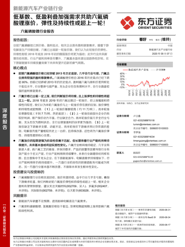 【东方证券】【20200907】六氟磷酸锂行业报告:低基数、低盈利叠加强需求共助六氟磷酸锂涨价,弹性及持续性或超上一轮!-19页