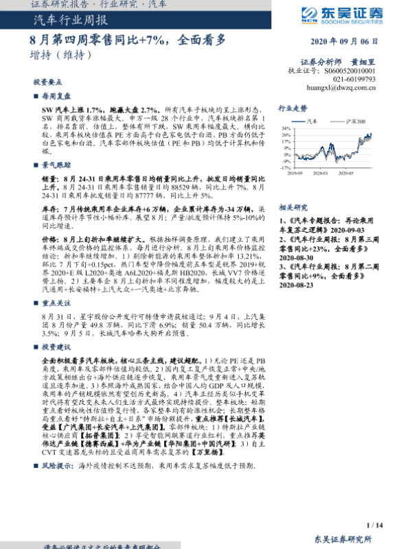 【东吴证券】【20200906】汽车行业周报:8月第四周零售同比+7%,全面看多-14页