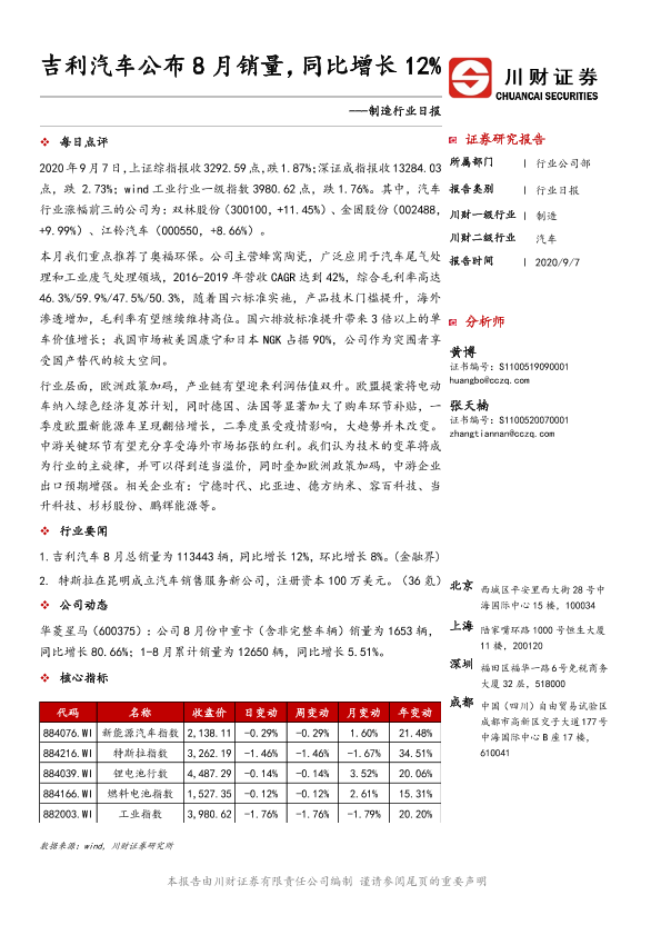 【川财证券】【20200907】制造行业日报:吉利汽车公布8月销量,同比增长12%-3页