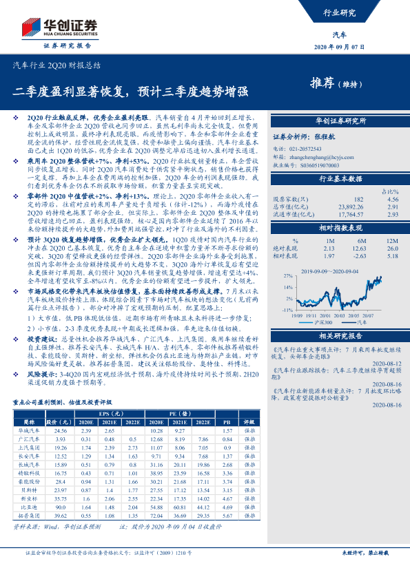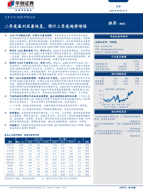 【华创证券】【20200907】汽车行业2Q20财报总结:二季度盈利显著恢复,预计三季度趋势增强-20页