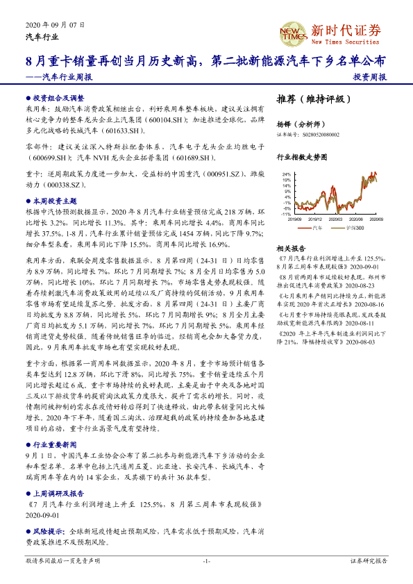 【新时代证券】【20200907】20200907-新时代证券-汽车行业周报:8月重卡销量再创当月历史新高,第二批新能源汽车下乡名单公布-20页