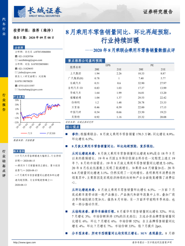 【长城证券】【20200908】2020年8月乘联会乘用车零售销量数据点评:8月乘用车零售销量同比、环比再超预期,行业持续回暖-3页