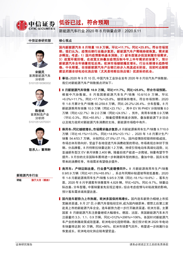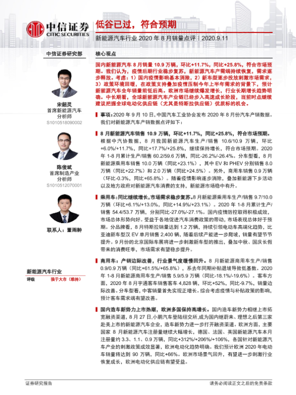 【中信证券】【20200911】新能源汽车行业2020年8月销量点评:低谷已过,符合预期-3页