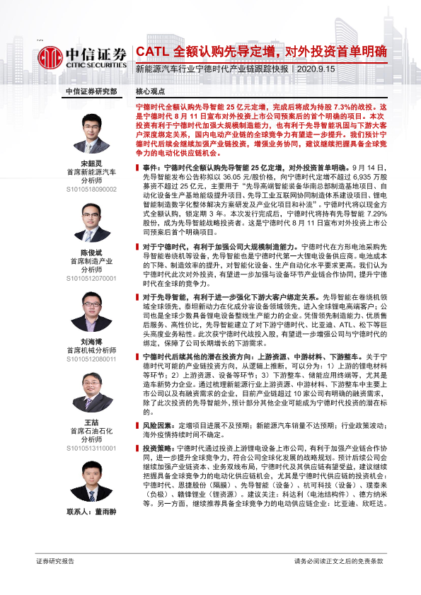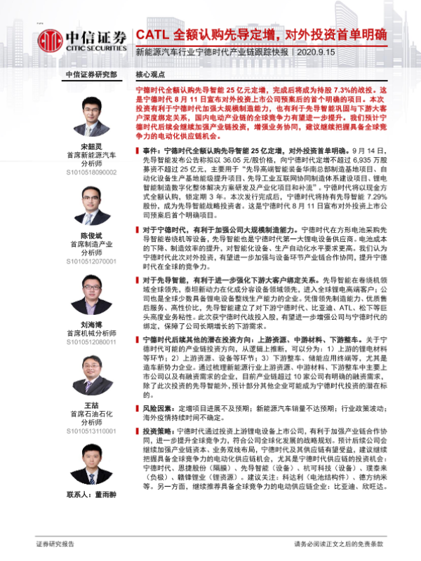 【中信证券】【20200915】新能源汽车行业宁德时代产业链跟踪快报:CATL全额认购先导定增,对外投资首单明确-3页