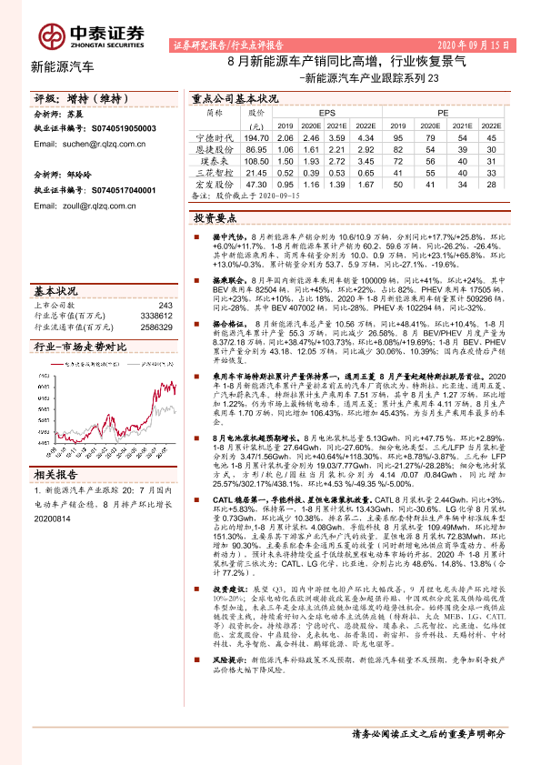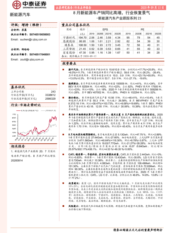 【中泰证券】【20200915】20200915-中泰证券-新能源汽车产业跟踪系列23:8月新能源车产销同比高增,行业恢复景气-12页