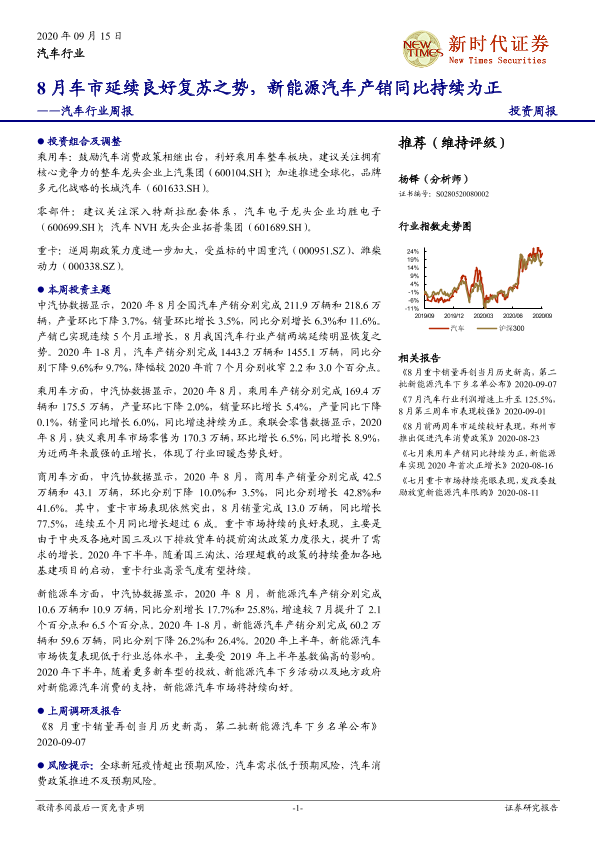 【新时代证券】【20200915】20200915-新时代证券-汽车行业周报:8月车市延续良好复苏之势,新能源汽车产销同比持续为正-19页