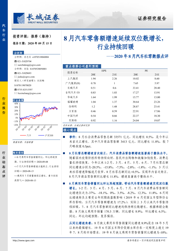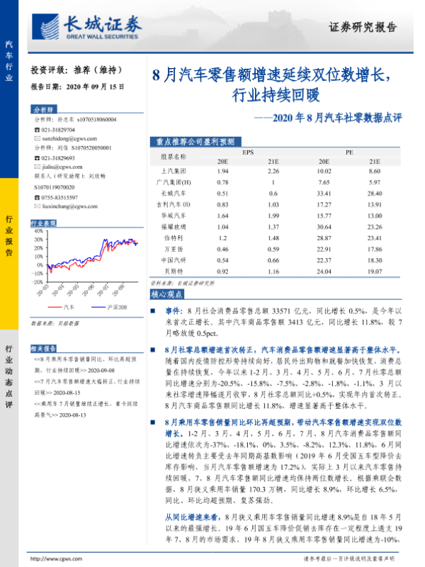 【长城证券】【20200915】2020年8月汽车社零数据点评:8月汽车零售额增速延续双位数增长,行业持续回暖-12页