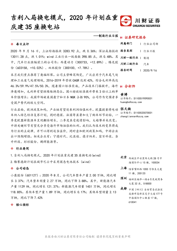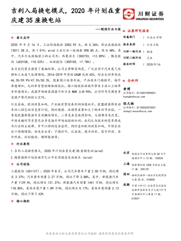 【川财证券】【20200916】制造行业日报:吉利入局换电模式,2020年计划在重庆建35座换电站-3页