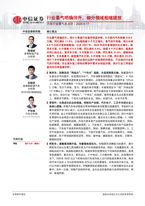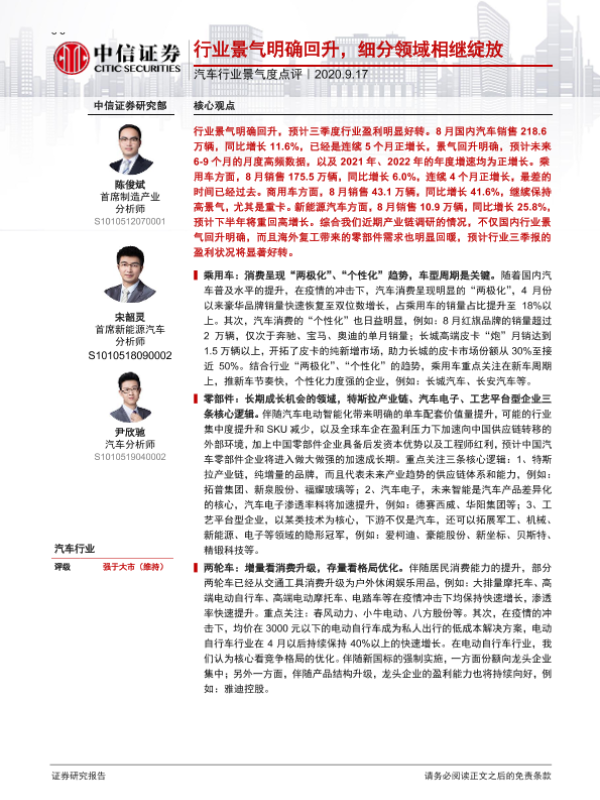 【中信证券】【20200917】汽车行业景气度点评:行业景气明确回升,细分领域相继绽放-5页