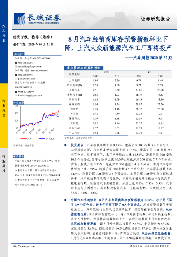 【长城证券】【20200921】汽车周报2020第32期:8月汽车经销商库存预警指数环比下降,上汽大众新能源汽车工厂即将投产-13页