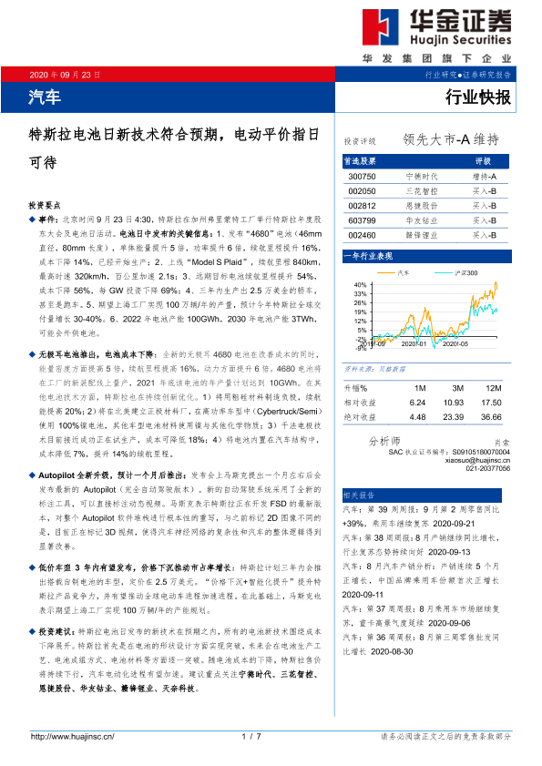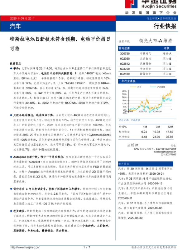 【华金证券】【20200923】汽车行业快报:特斯拉电池日新技术符合预期,电动平价指日可待-7页