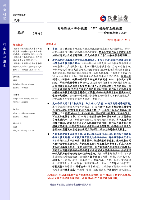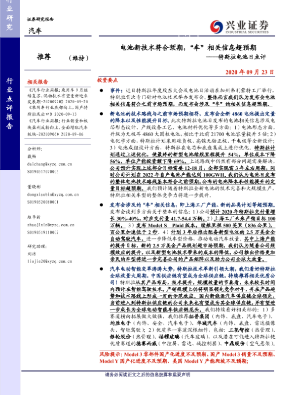 【兴业证券】【20200923】20200923-兴业证券-特斯拉电池日点评:电池新技术符合预期,“车”相关信息超预期-4页