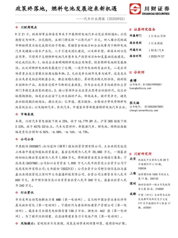 【川财证券】【20200927】汽车行业周报:政策终落地,燃料电池发展迎来新机遇-10页