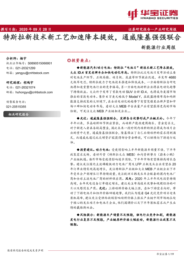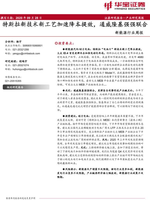 【华宝证券】【20200928】新能源行业周报:特斯拉新技术新工艺加速降本提效,通威隆基强强联合-19页