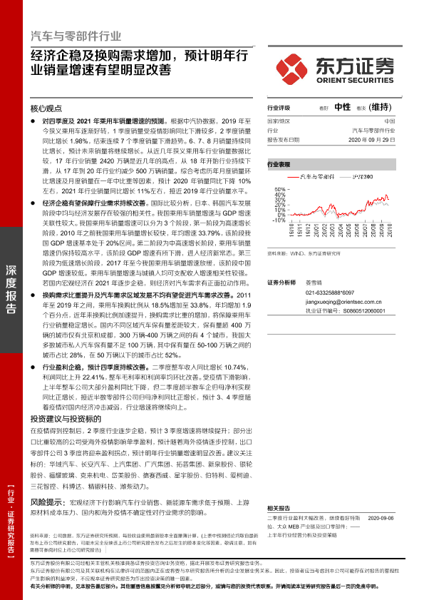 【东方证券】【20200929】汽车与零部件行业深度报告:经济企稳及换购需求增加,预计明年行业销量增速有望明显改善-19页