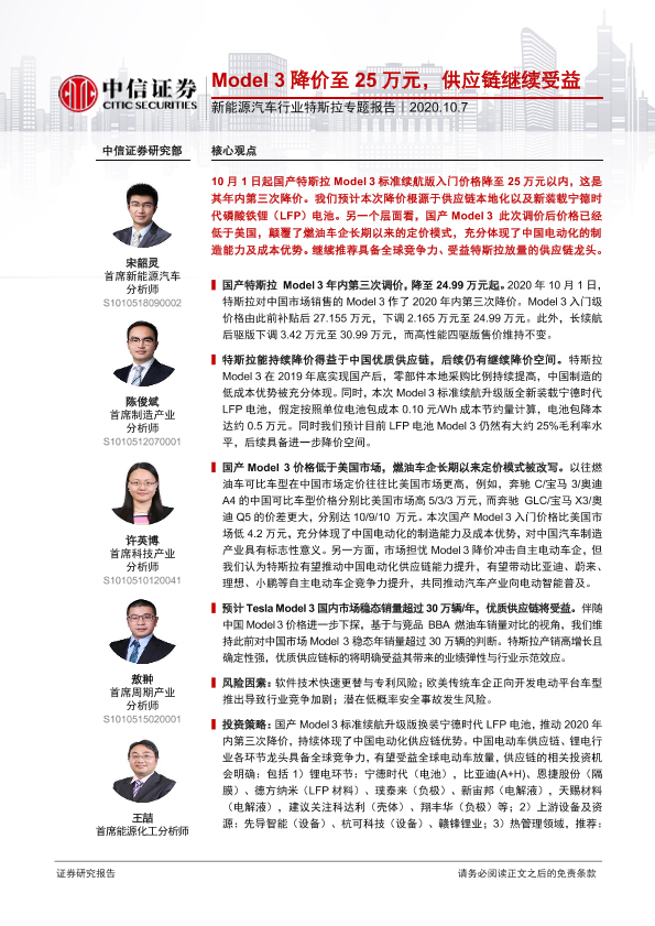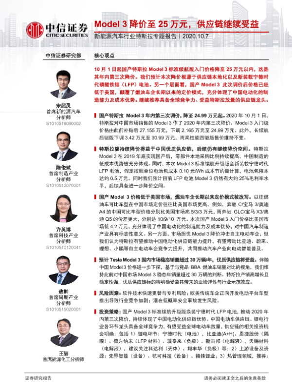 【中信证券】【20201007】新能源汽车行业特斯拉专题报告:Model3降价至25万元,供应链继续受益-13页