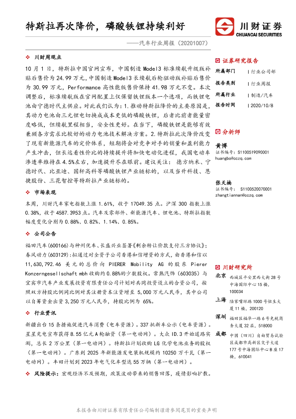 【川财证券】【20201008】20201007-川财证券-汽车行业周报:特斯拉再次降价,磷酸铁锂持续利好-10页